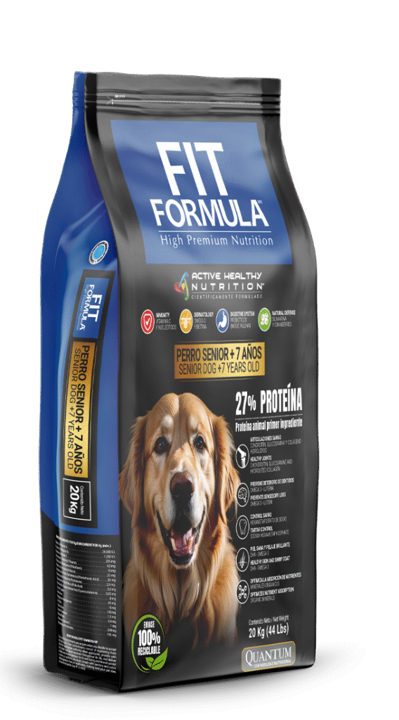 FIT FORMULA® Senior, ha sido especialmente desarrollado para mantener y mejorar la calidad de vida de su mascota en edad avanzada. A medida que su perro envejece, el ritmo de su metabolismo disminuye, pierde masa muscular y aumenta su grasa corporal. Baja el tránsito intestinal y la capacidad de absorber nutrientes. La piel pierde elasticidad y se vuelve escamosa. El pelo se debilita, se vuelve seco, sin brillo y comienzan a aparecer las canas. Se degeneran las articulaciones. Decae el sistema inmunológico. Se pierden progresivamente los sentidos de la visión, olfato, oído y gusto. Se degenera el sistema nervioso central, provocando cambios en su comportamiento, desorientación e incapacidad de reaccionar al medio que los rodea.